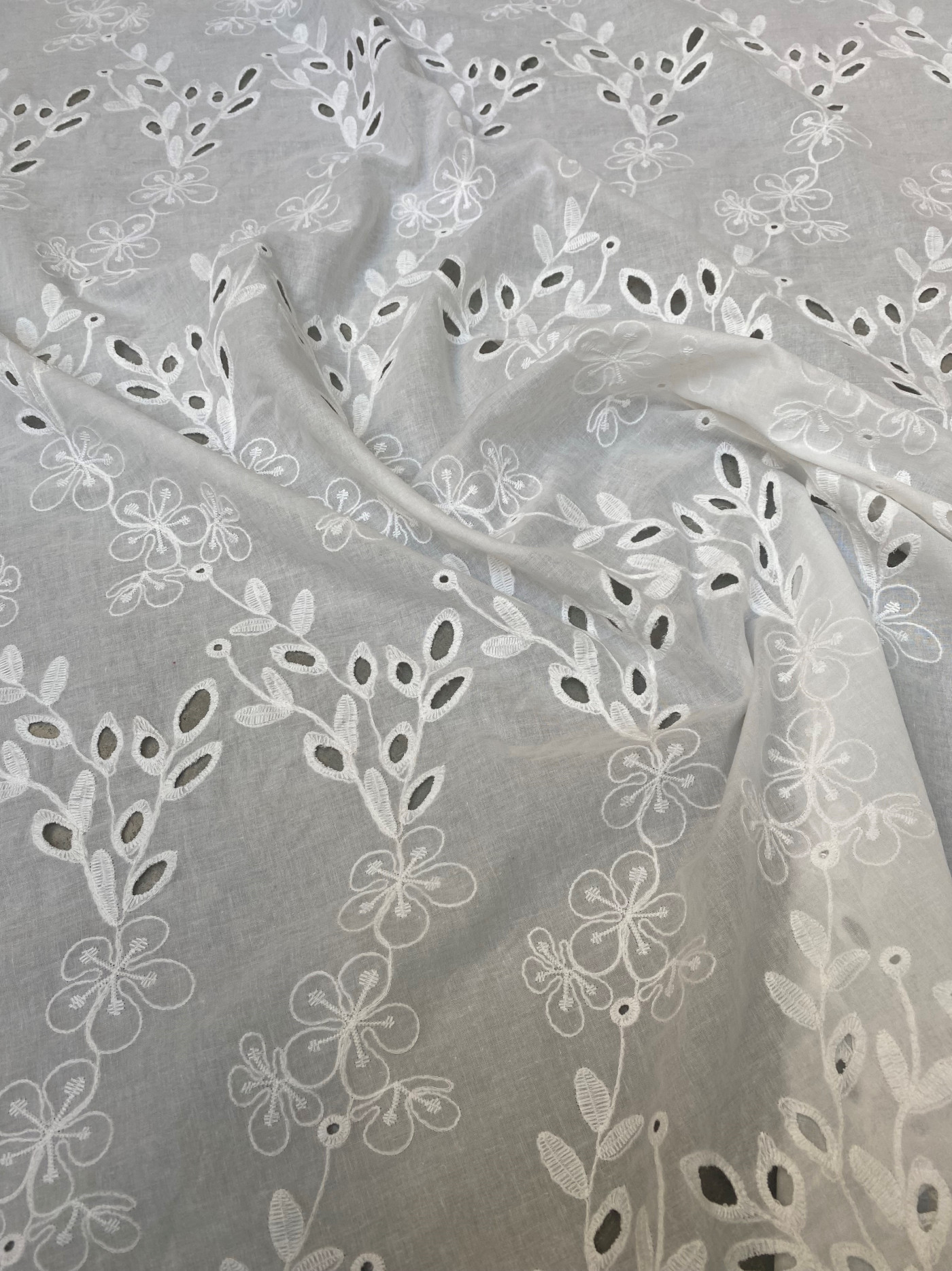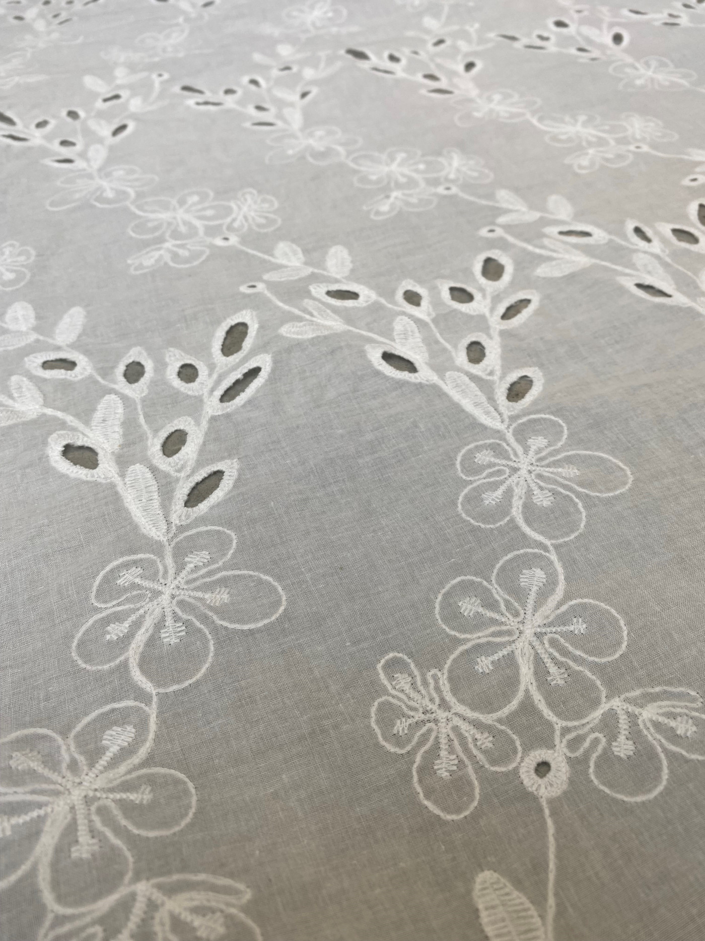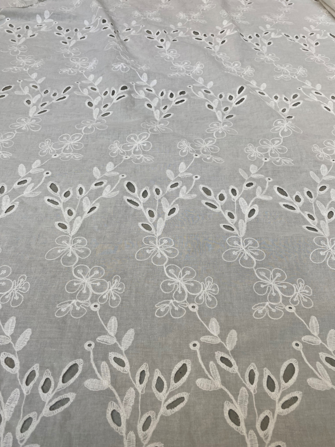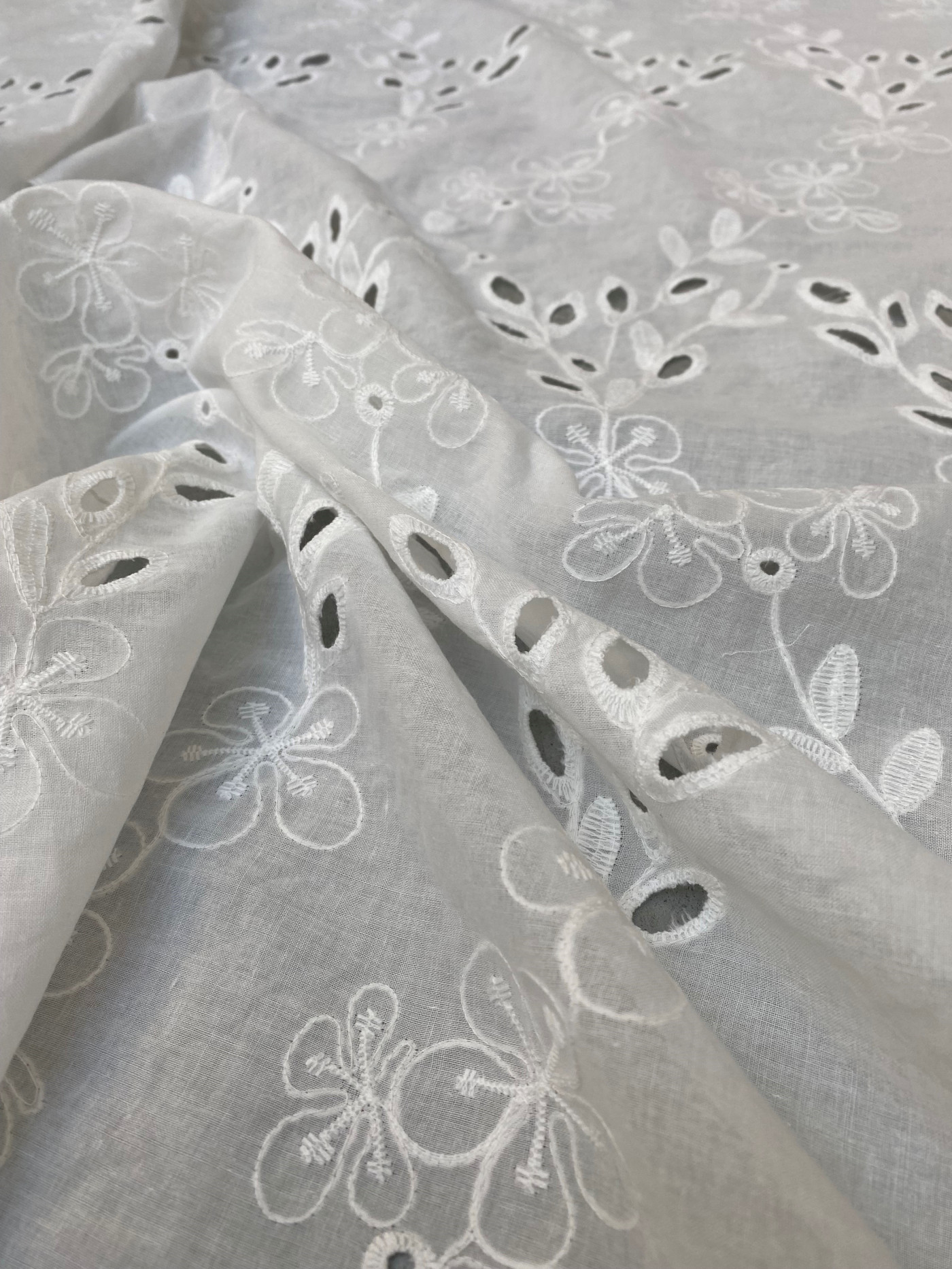 Tissu broderie anglaise blanche en coton. Ce tissu ajouré est présenté sur un fond gris foncé. Cette broderie au motif végétal, associée à une doublure, vous permettra de réaliser des tops, blouses, chemisiers, robes, jupes…