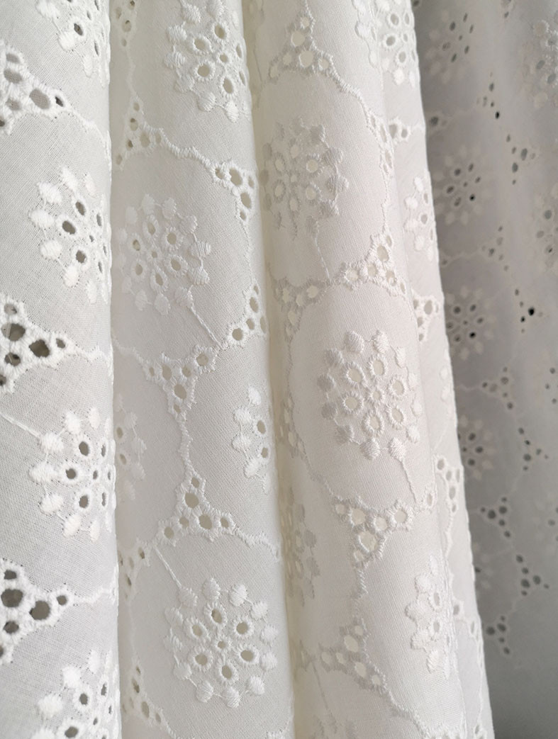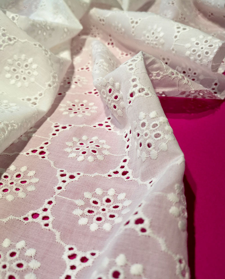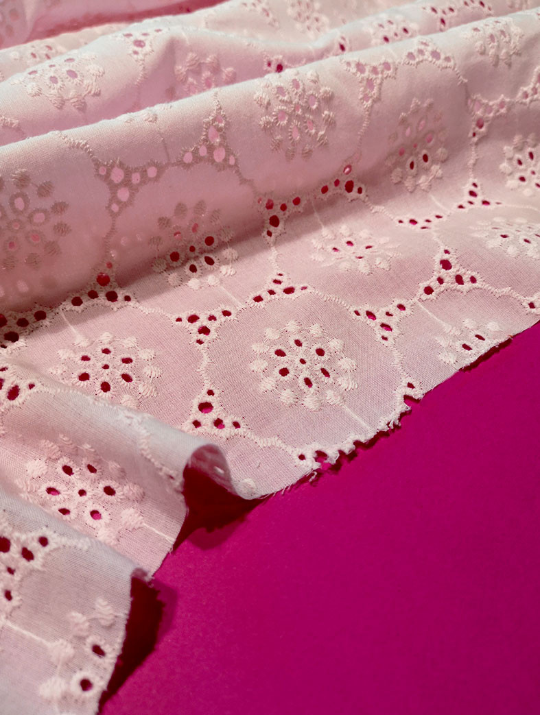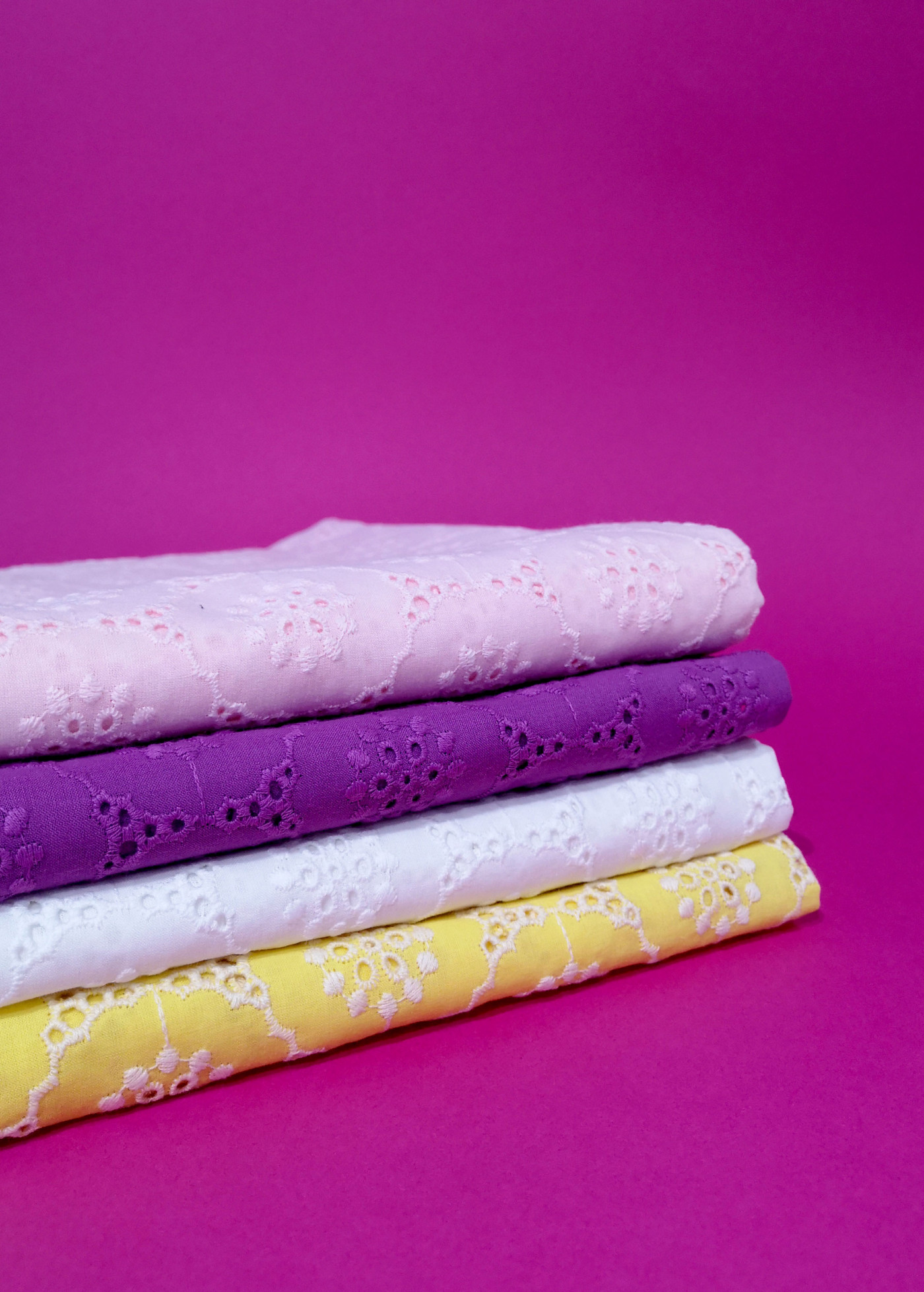 Très belle broderie anglaise ajourée dans un style romantique et bohème dans un jeu de courbes et de ronds . Cette broderie déclinée en 4 coloris vous permettra de confectionner des pièces de hauts et de bas (prévoir une doublure).