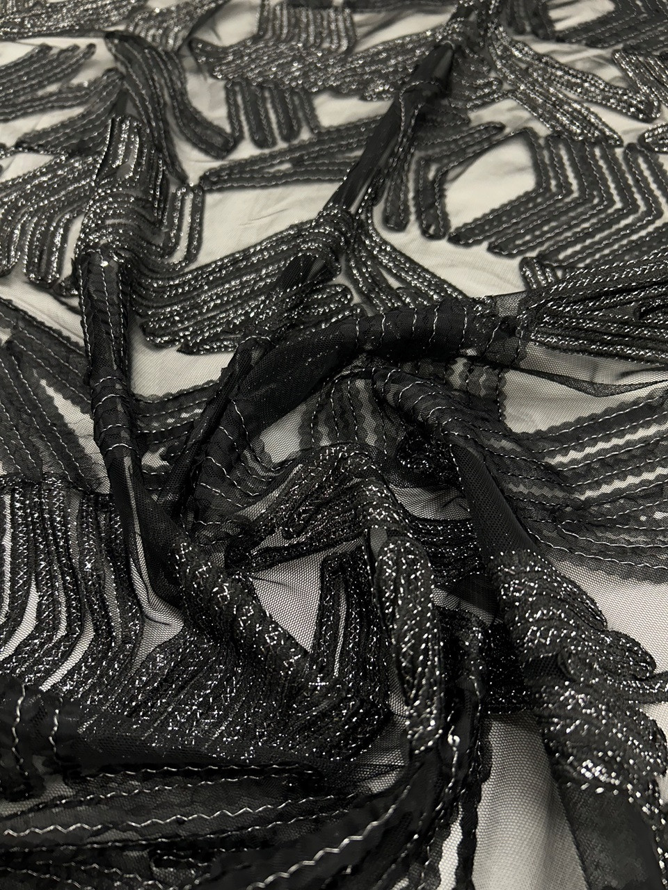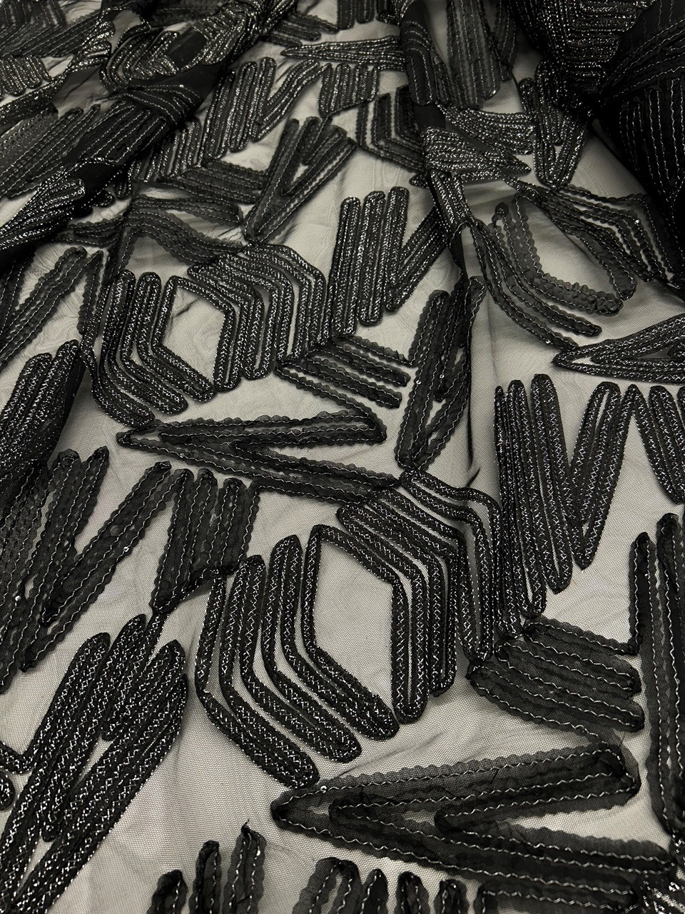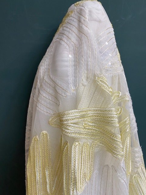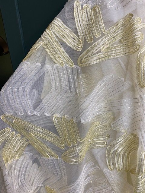 Tissu broderie chevrons sur tulle, décliné en 2 coloris: Blanc et Or, Noir et Argent. Ce tissu est transparent et nécessite une doublure pour la réalisation de robes ou jupes.
