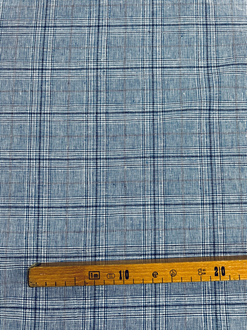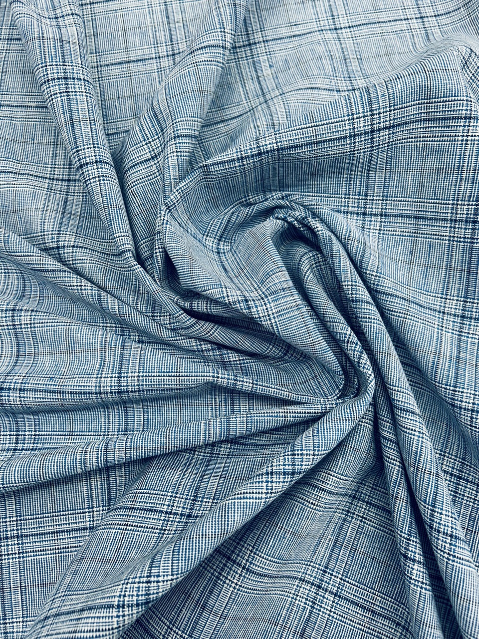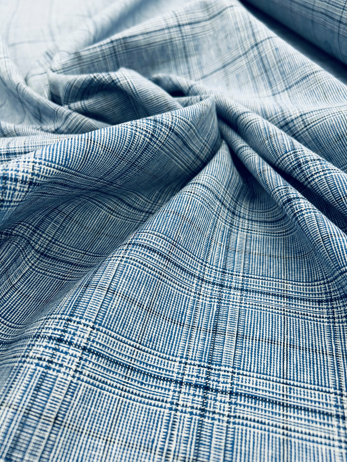 Tissu toile de lin et coton à carreaux dans des tons de bleu. Ce tissu conviendra parfaitement pour la confection de chemises, robes, pantalon, accessoires…