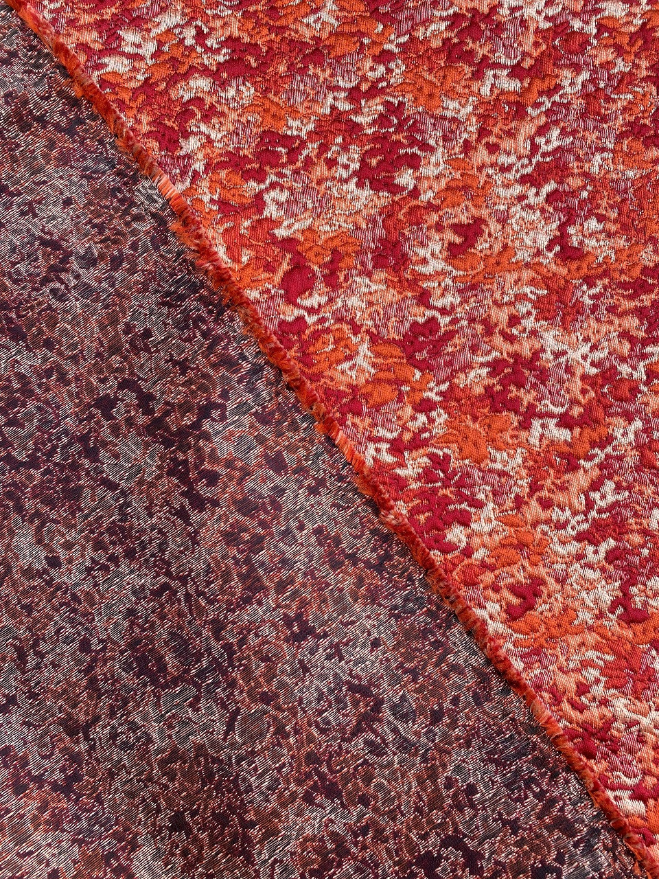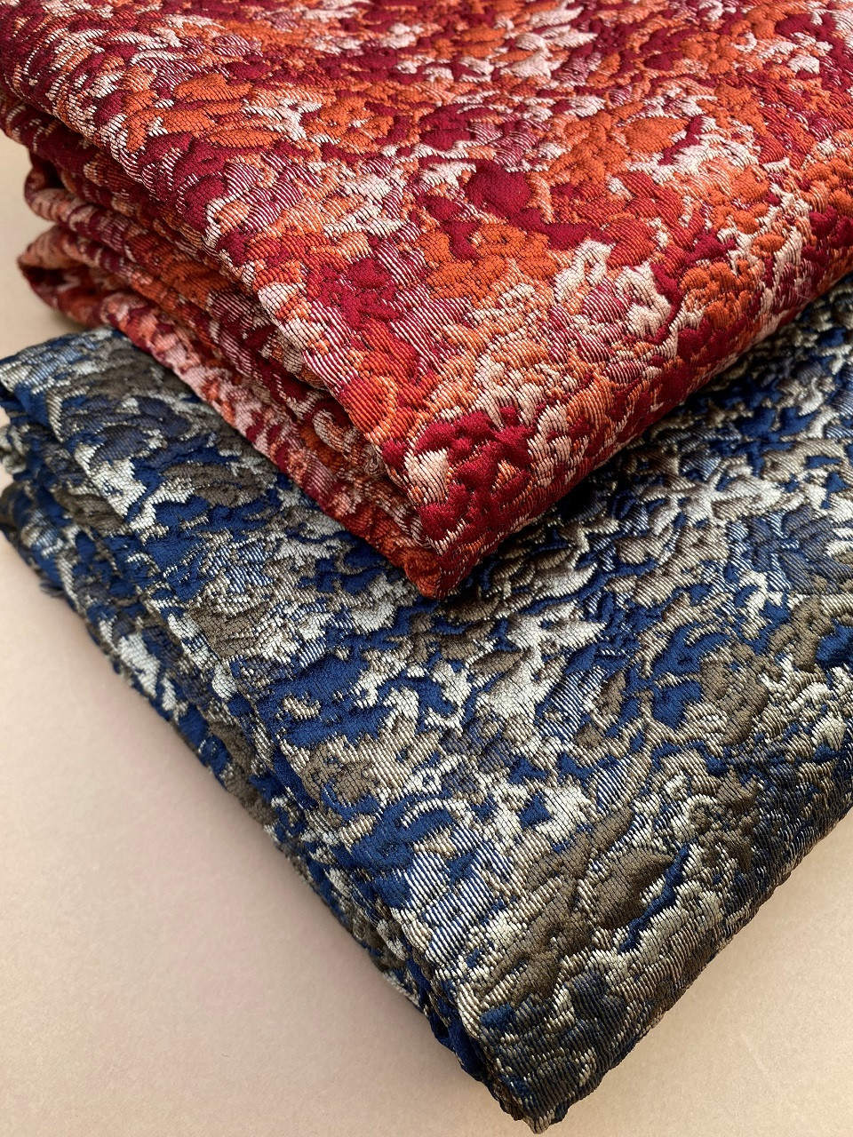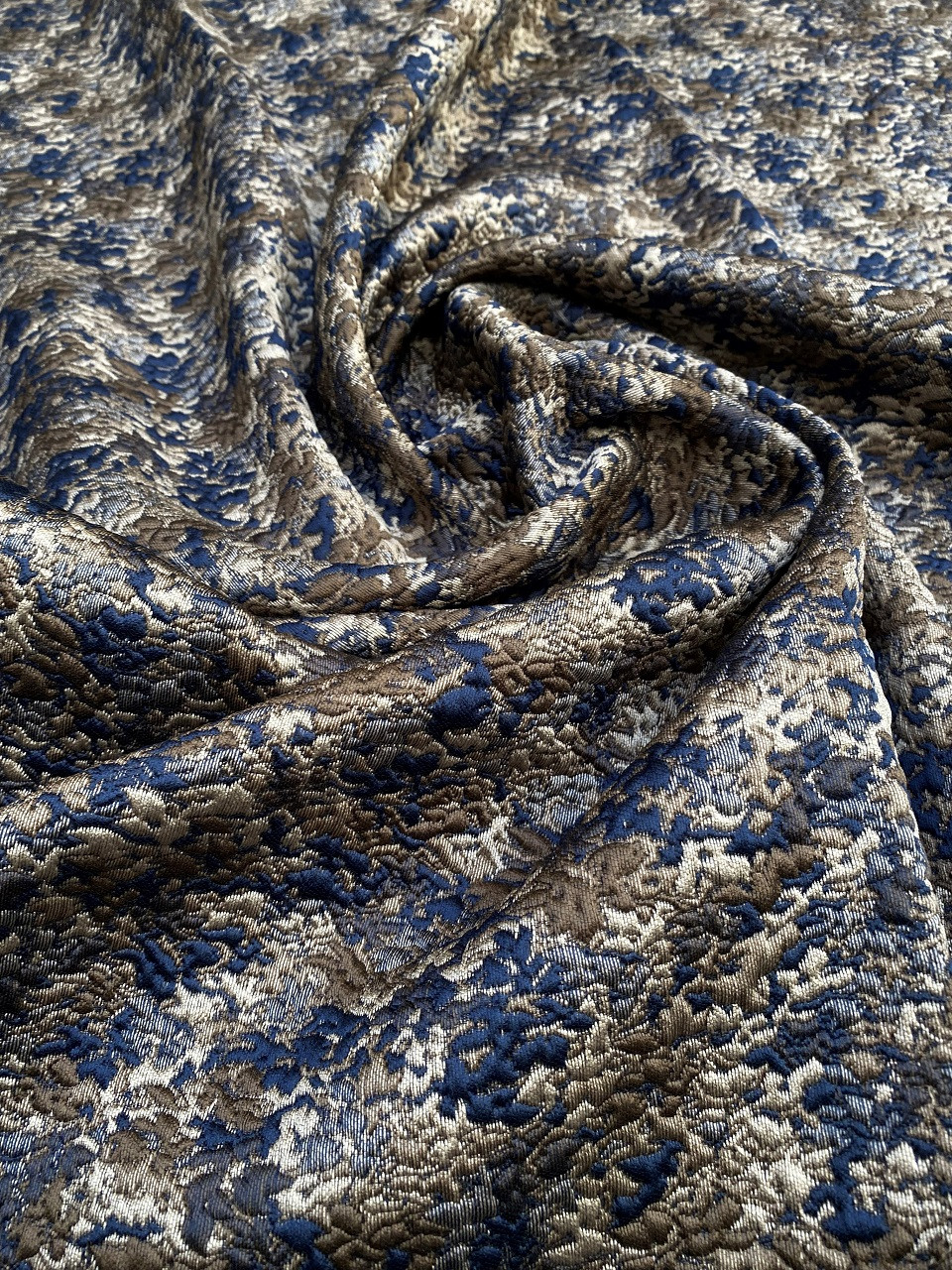 Très beau tissu jacquard issu de la collection Automne Hiver 2024, fabriqué en Italie. Ce tissu jacquard texturé, présente des formes abstraites formant un camouflage.