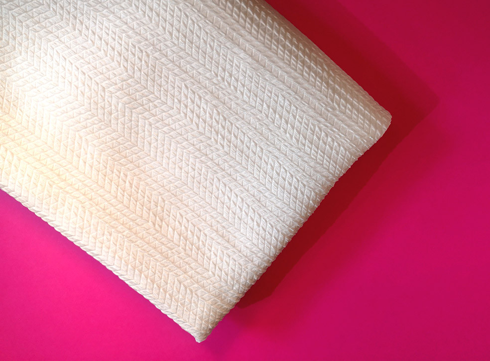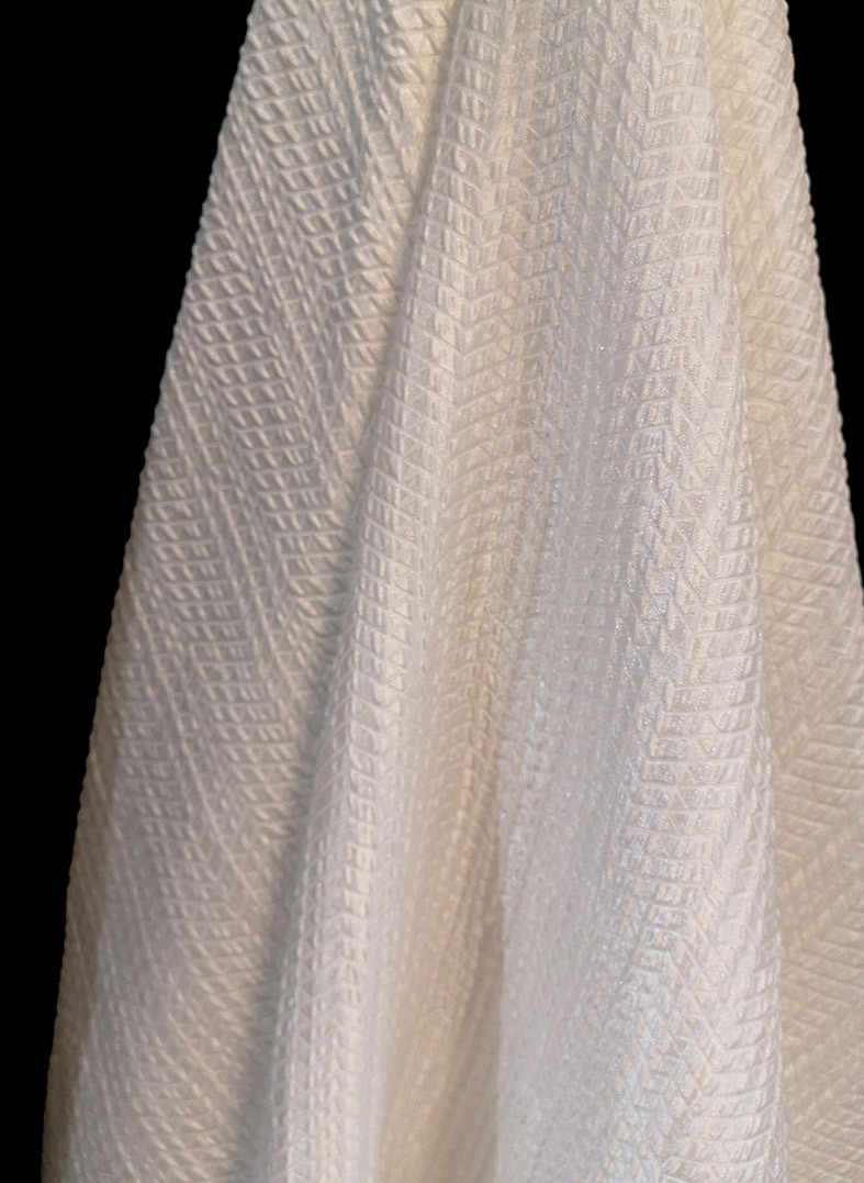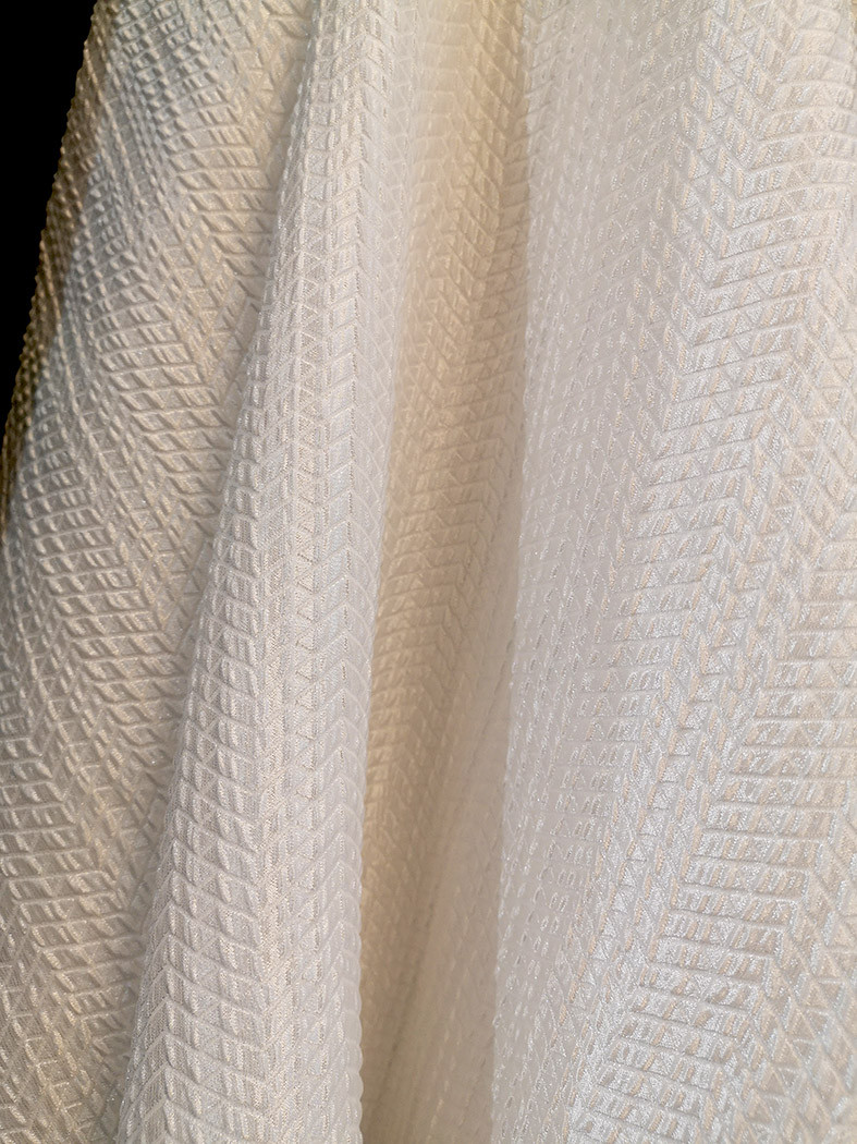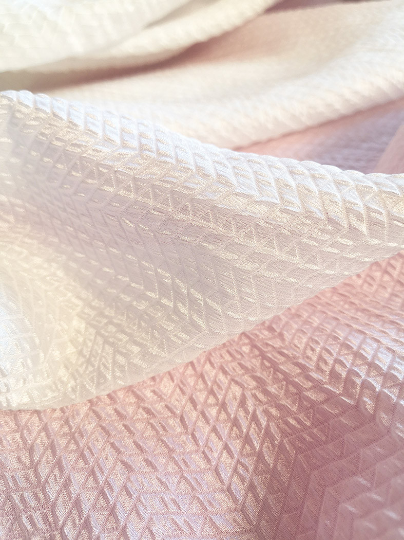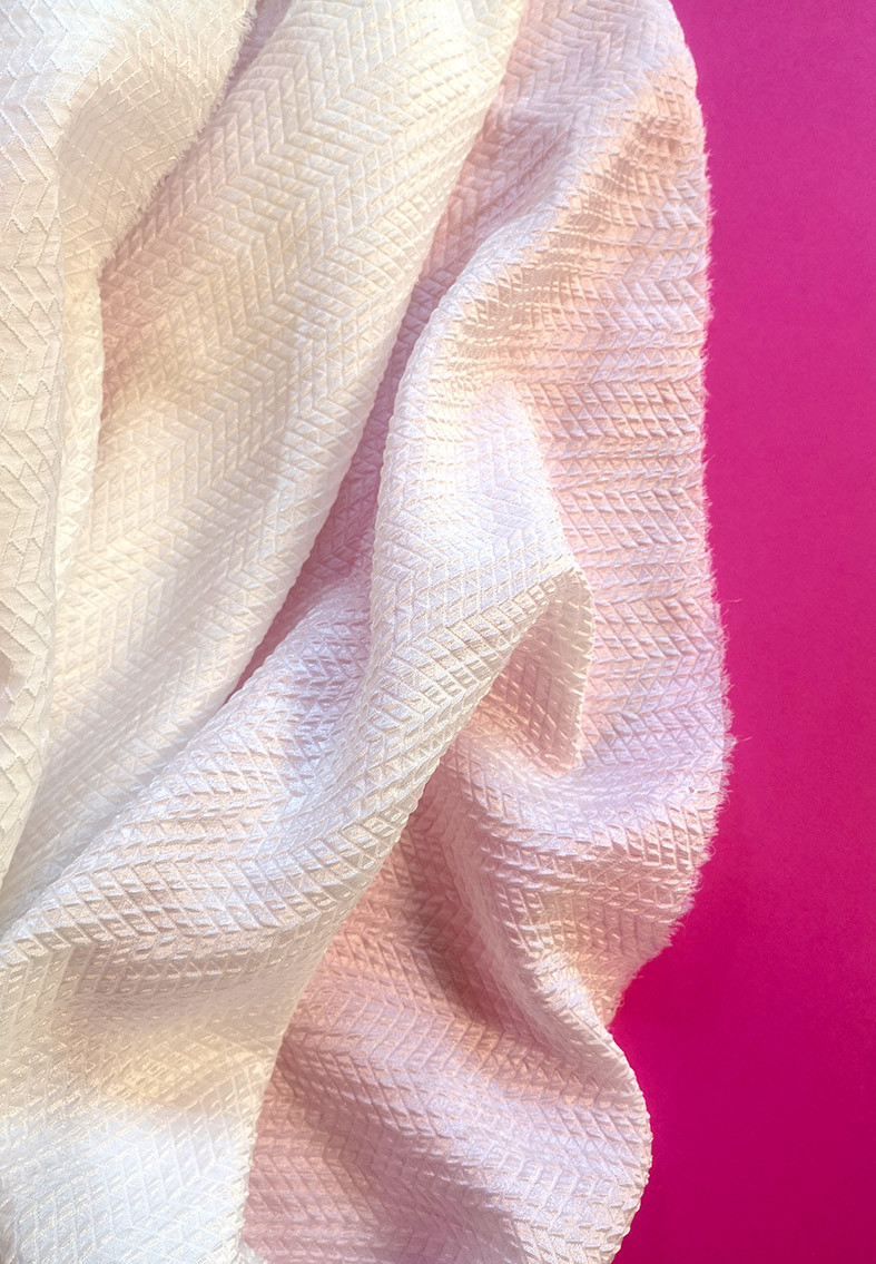 Tissu jacquard issu de la nouvelle collection Printemps Eté 2022. Ce jacquard texturé, légèrement gaufré, représente un motif avec des petits chevrons sur un fond blanc nacré. Ce tissu léger vous permettra de réaliser vos pièces telles que des blouses, vestes, robes, jupes, shorts…