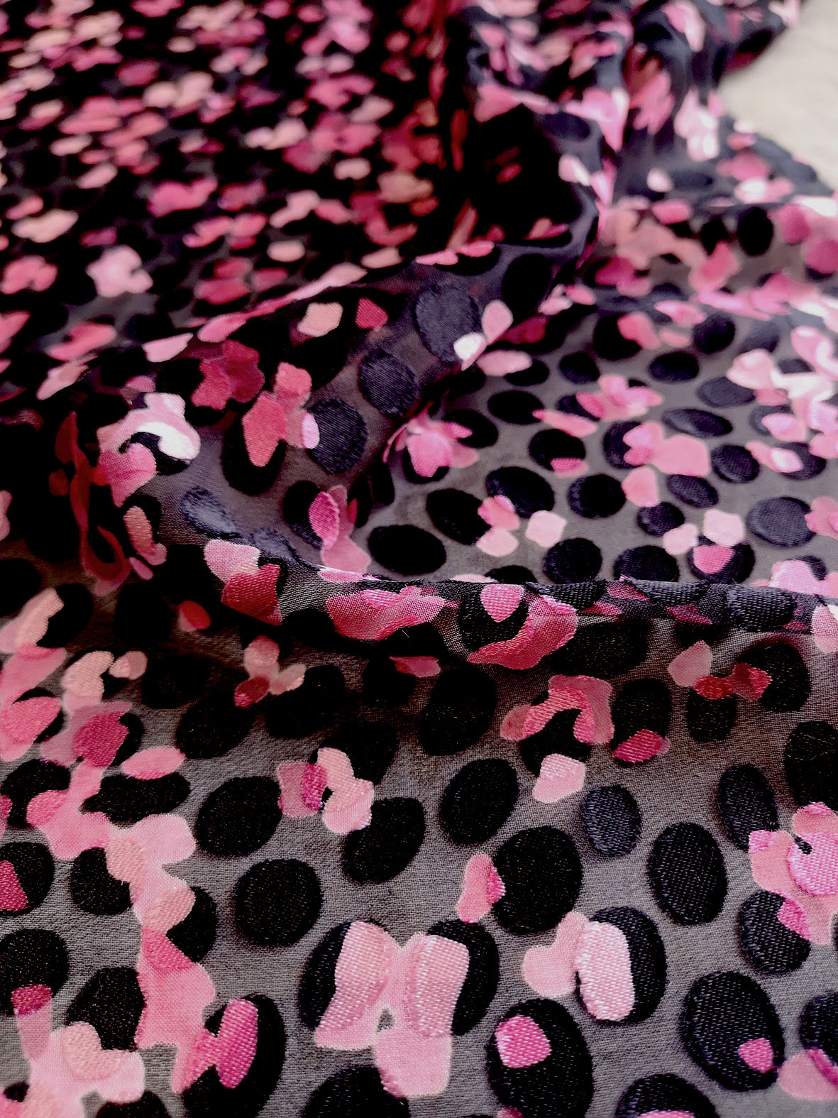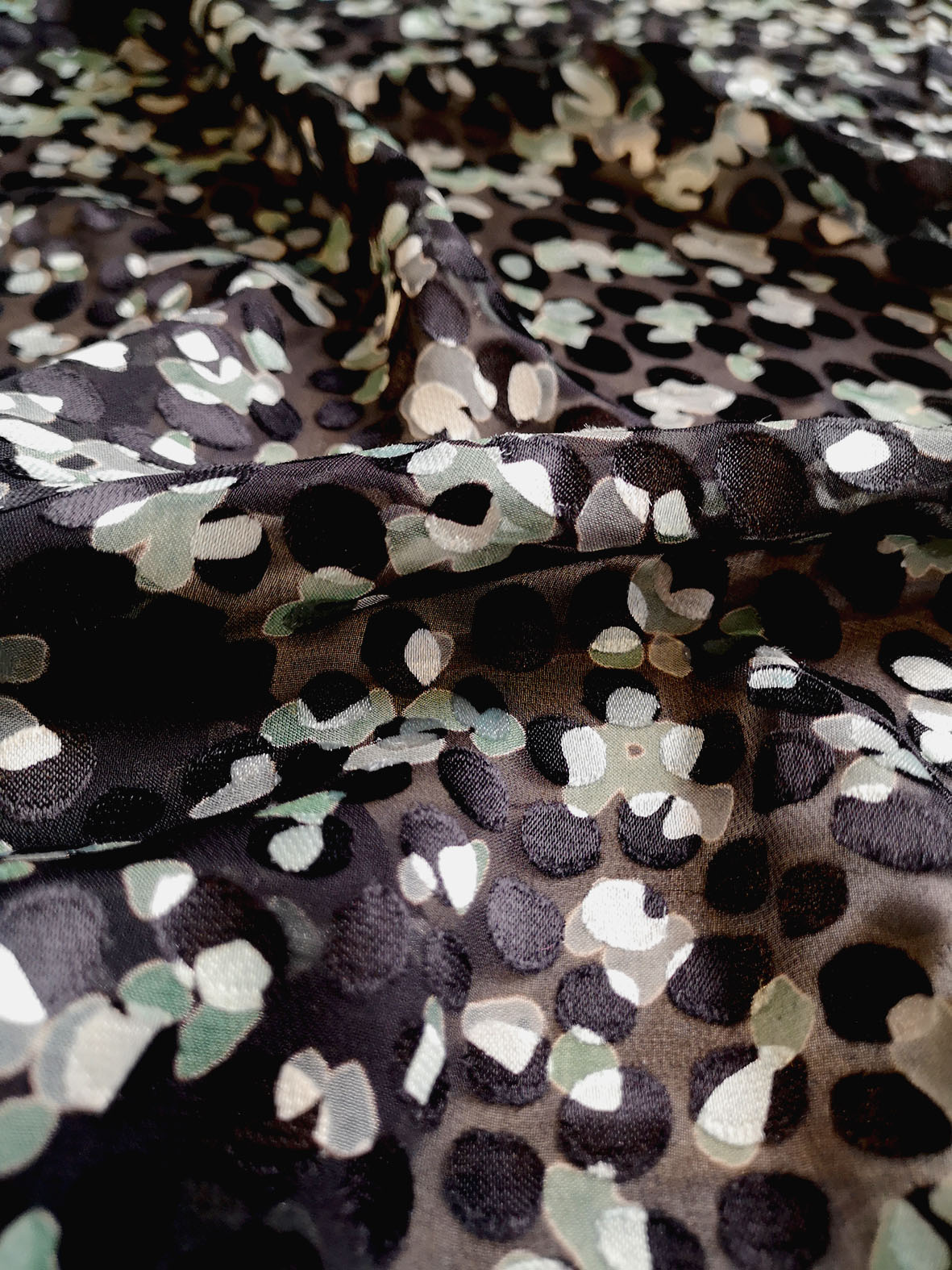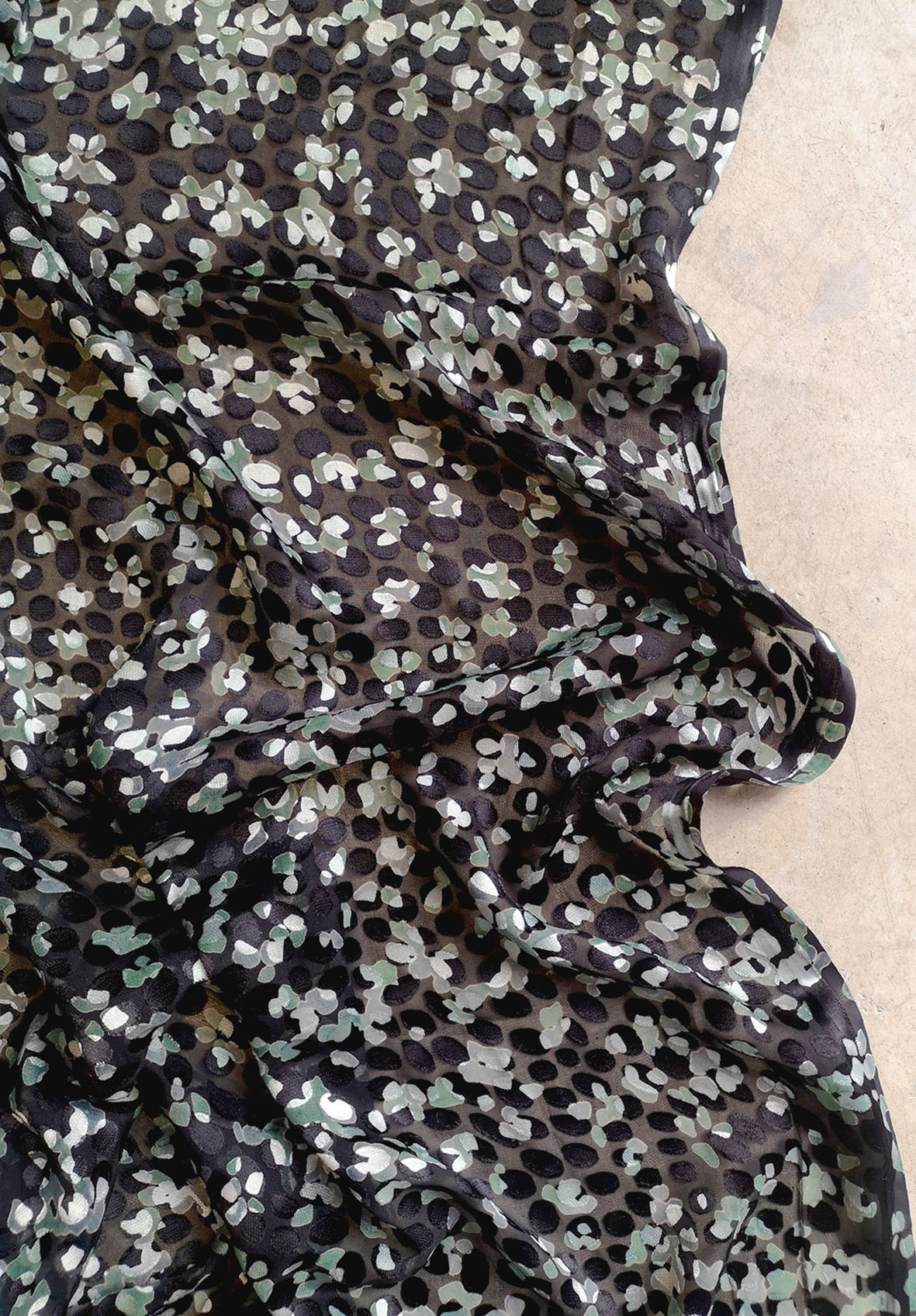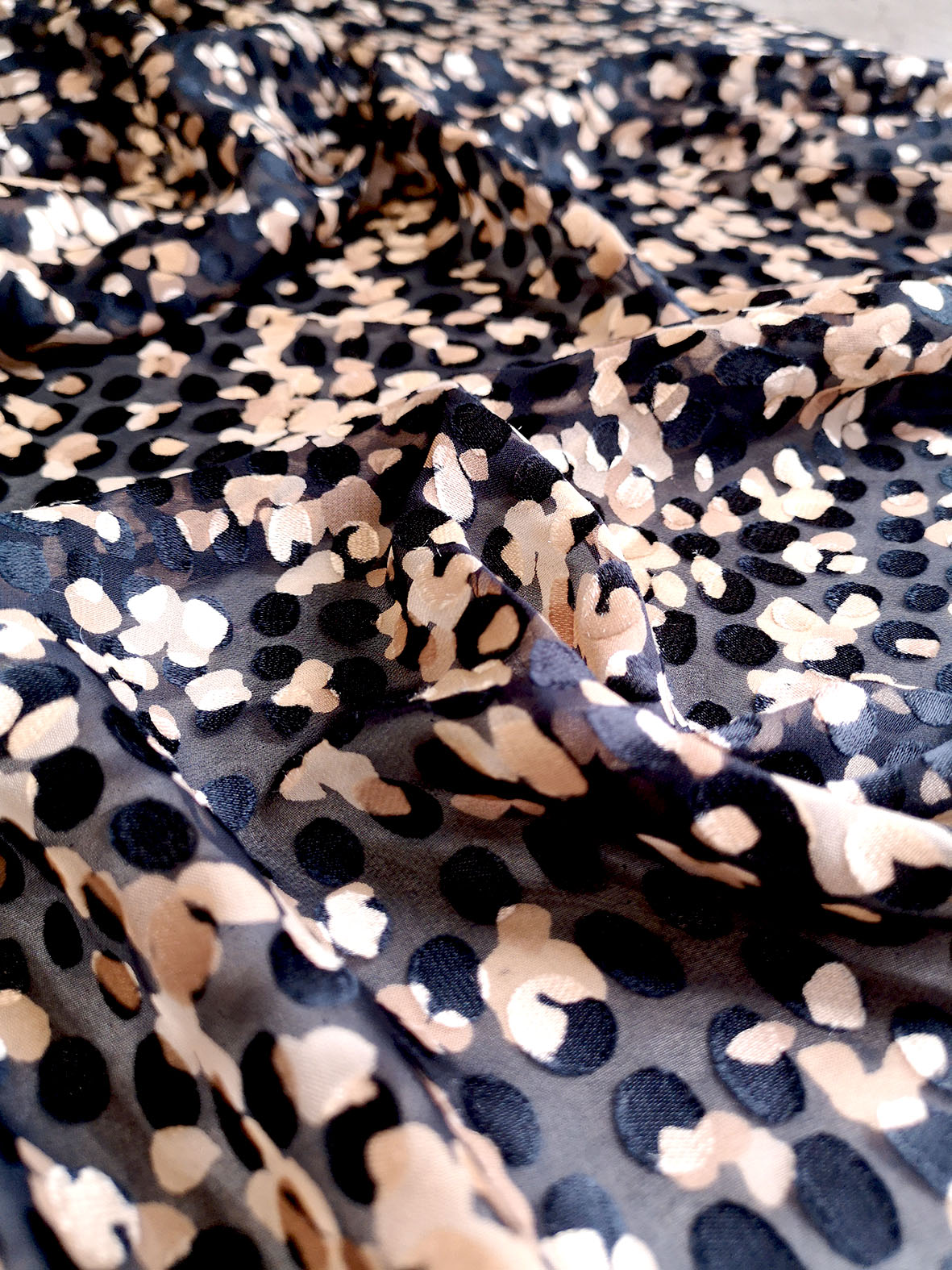 Imprimé sur un dévoré satiné viscose soie. Joli motif entre le pois et la peau de bête.