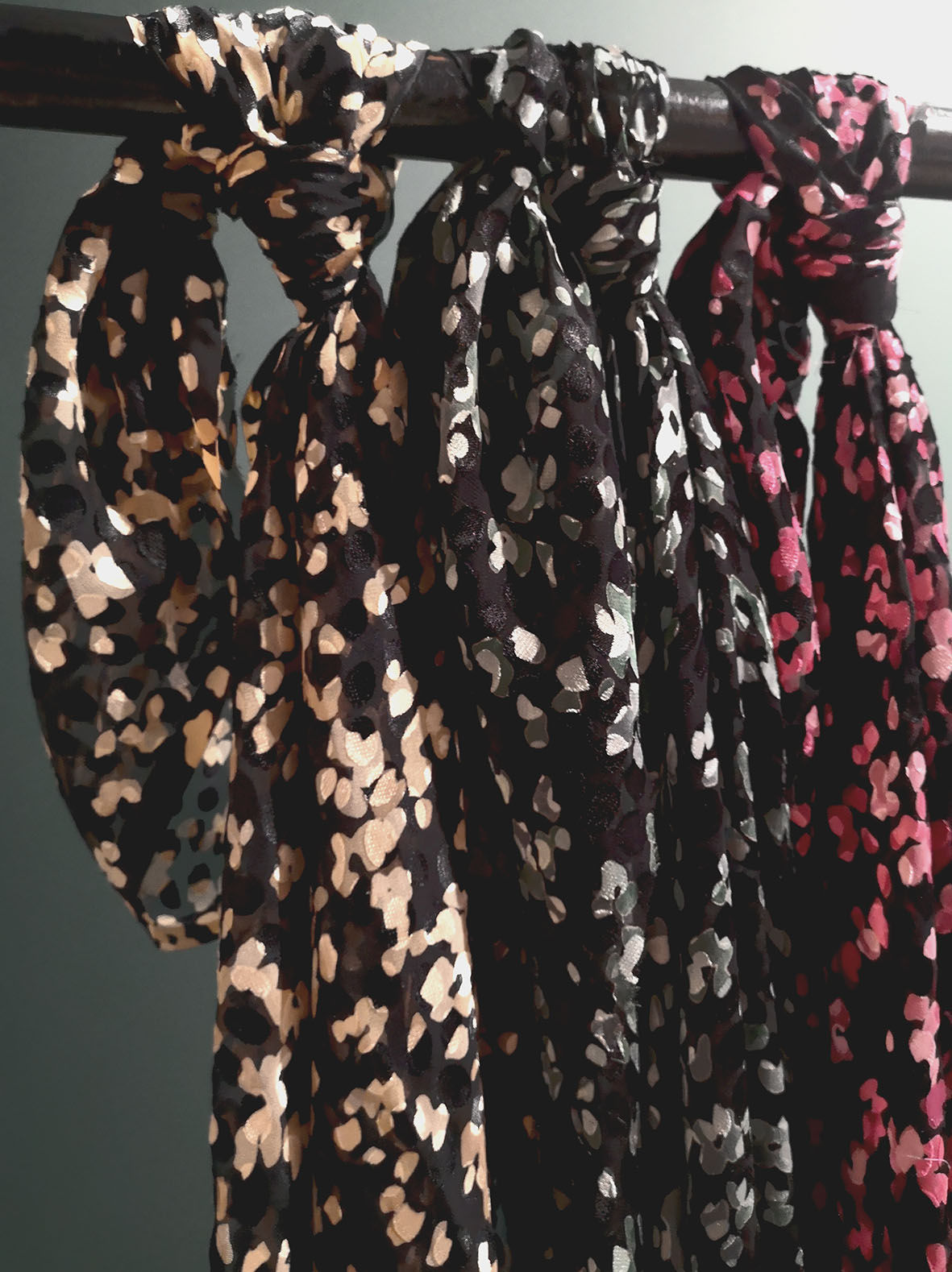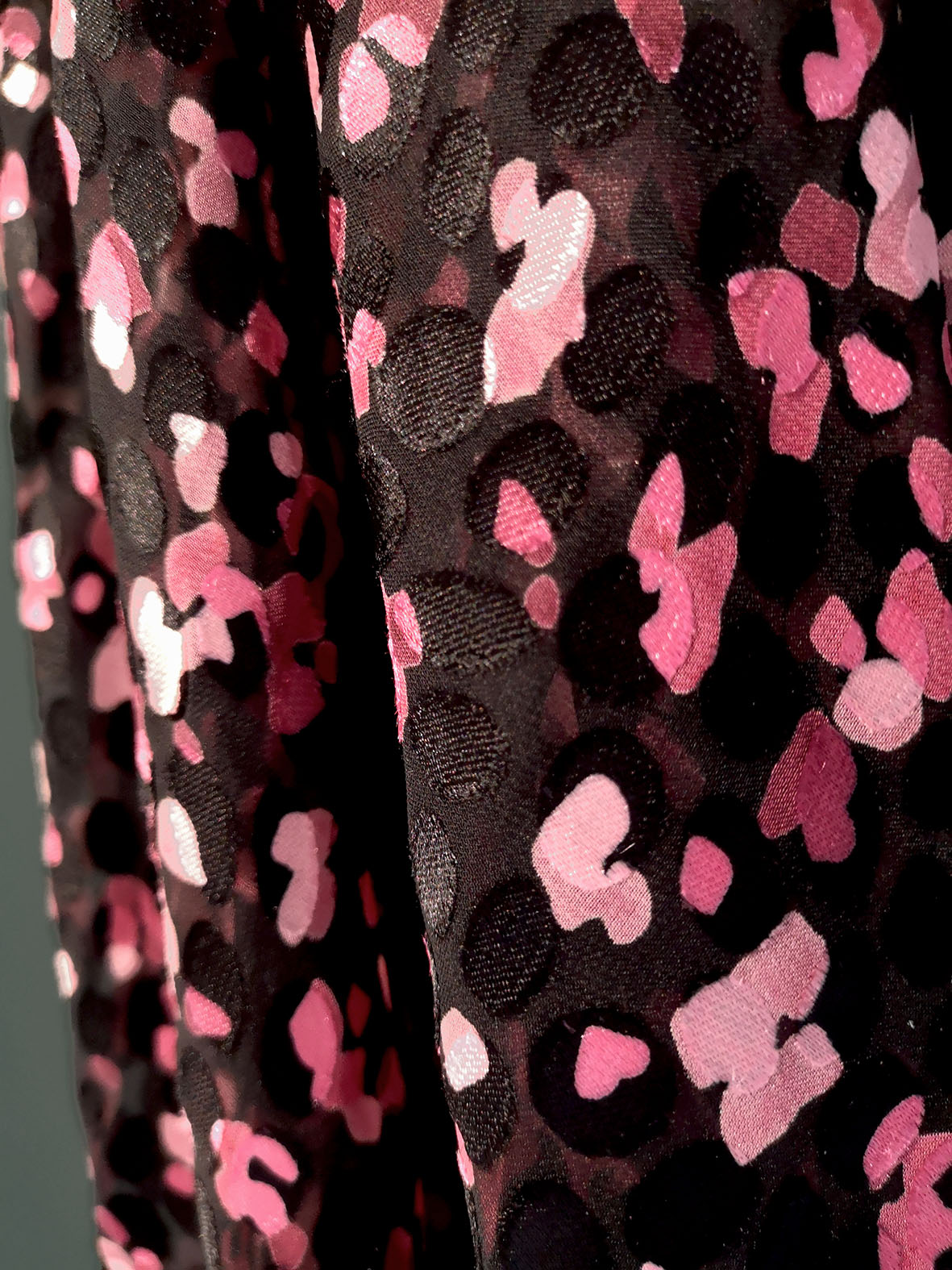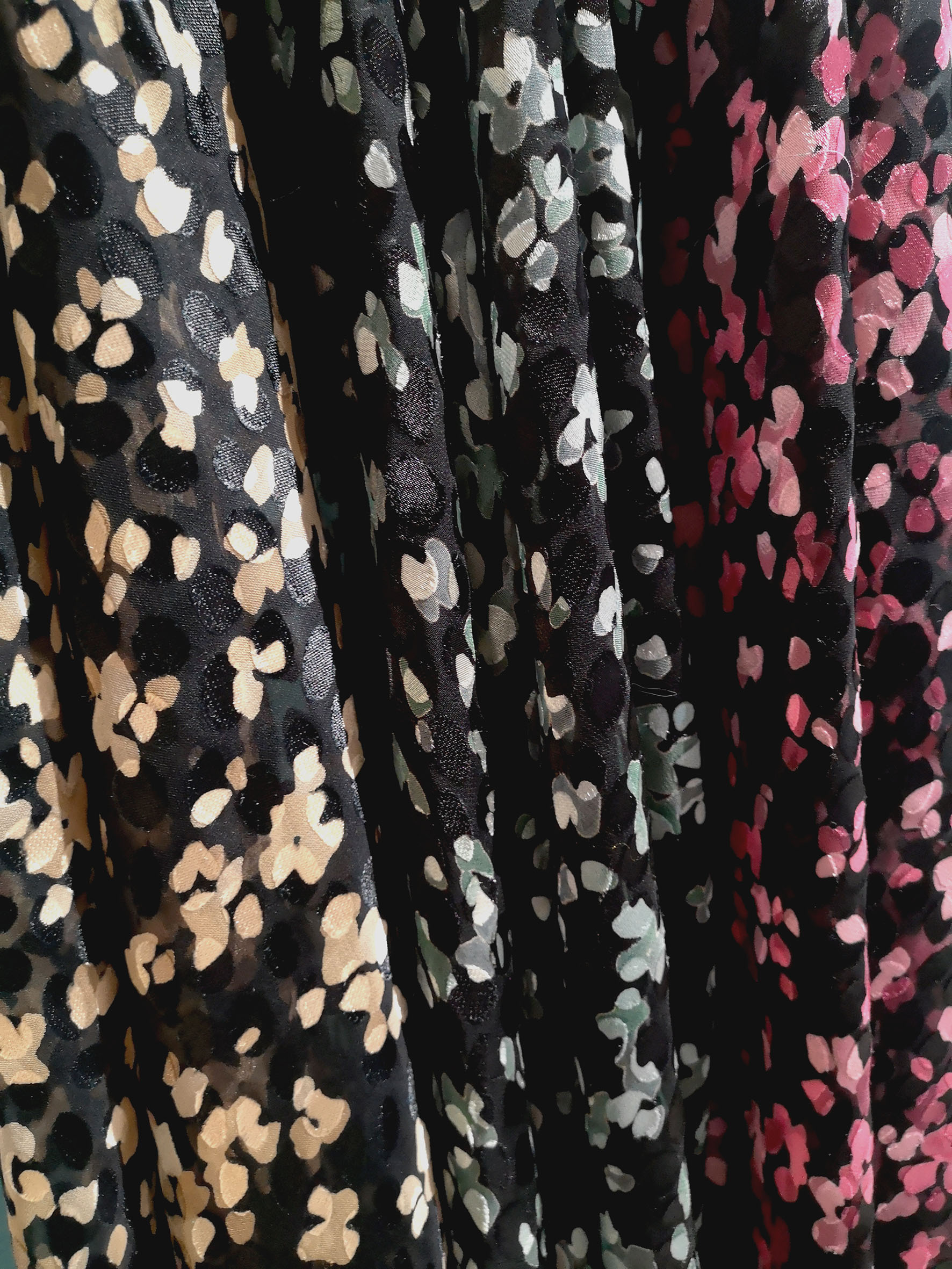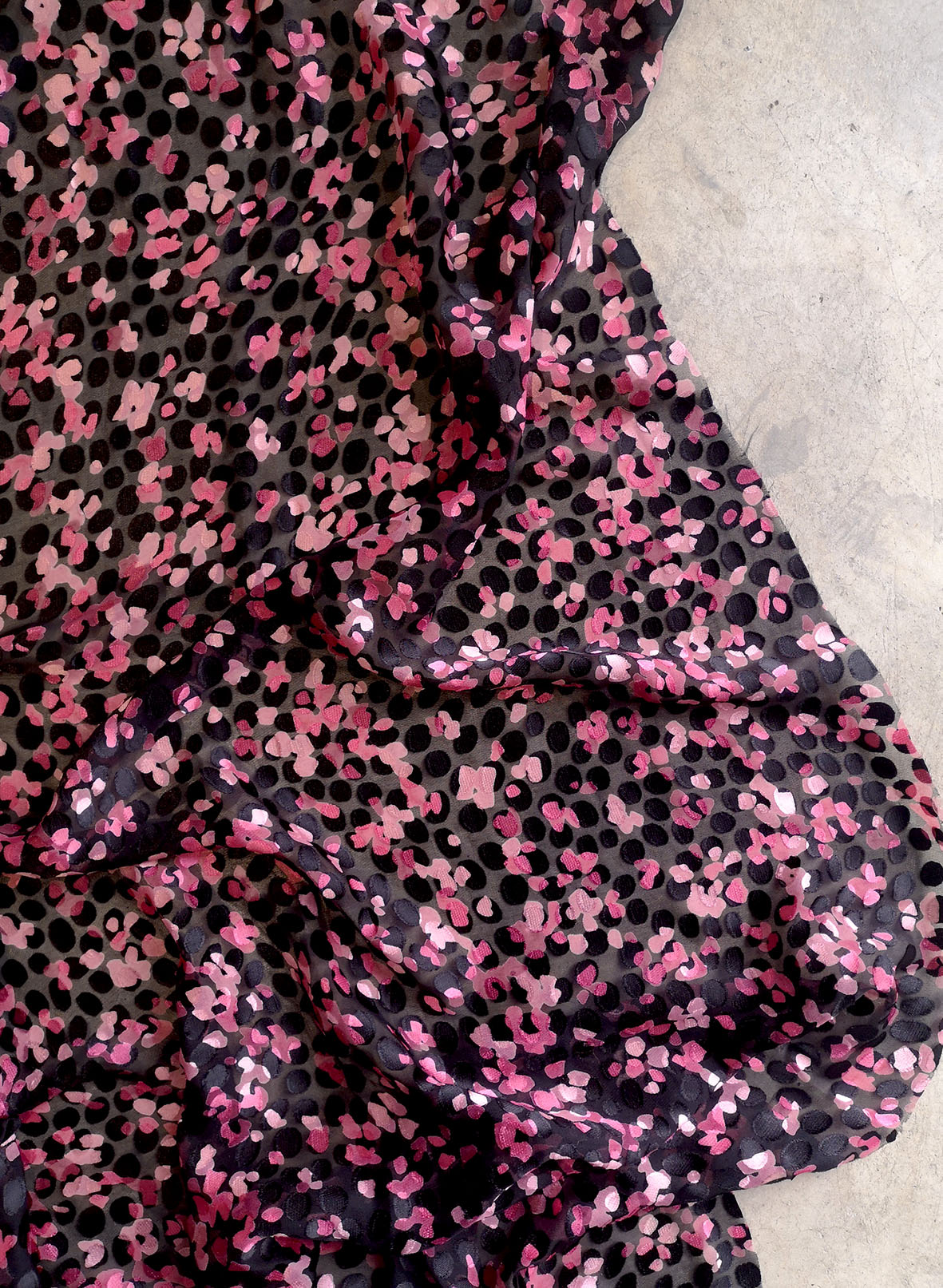 Imprimé sur un dévoré satiné viscose soie. Joli motif entre le pois et la peau de bête.